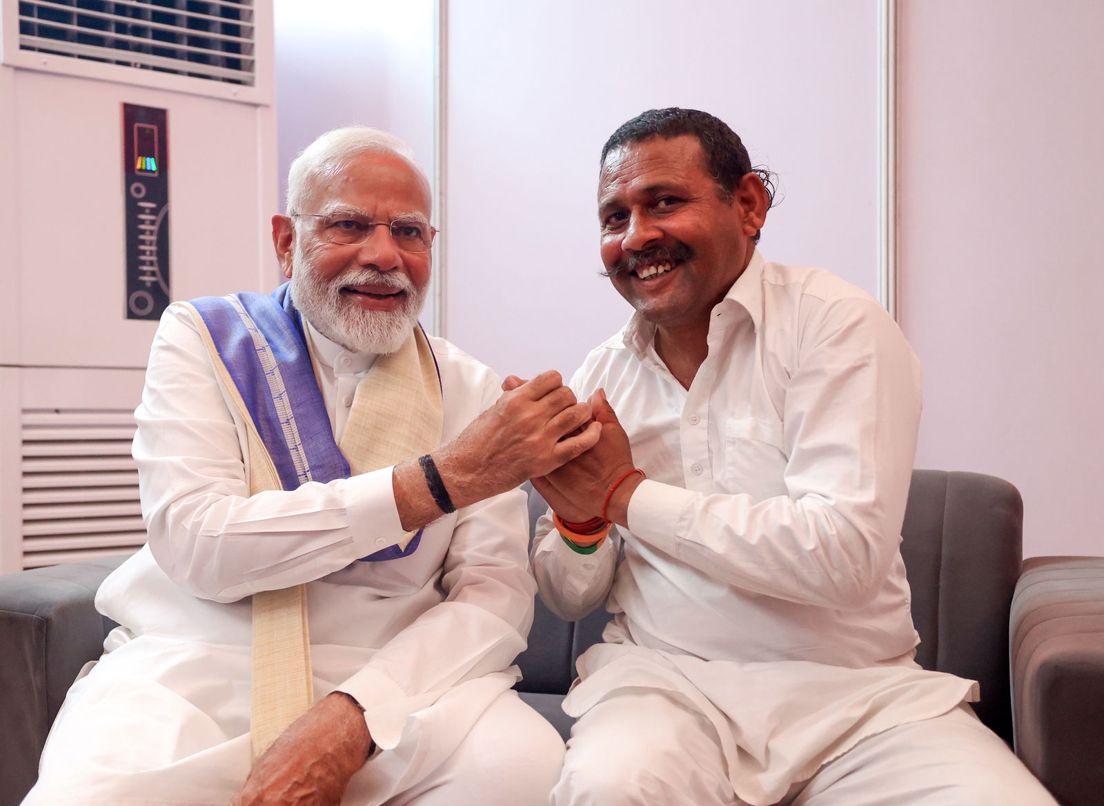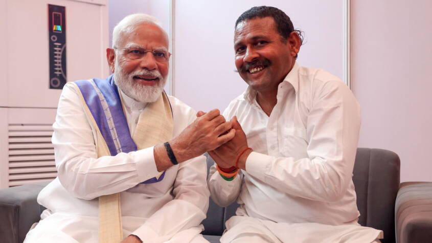“At today’s public meeting in Yamunanagar, I met Shri Rampal Kashyap Ji from Kaithal. He had taken a vow 14 years ago- that he will only wear footwear after I became PM and he got to meet me.