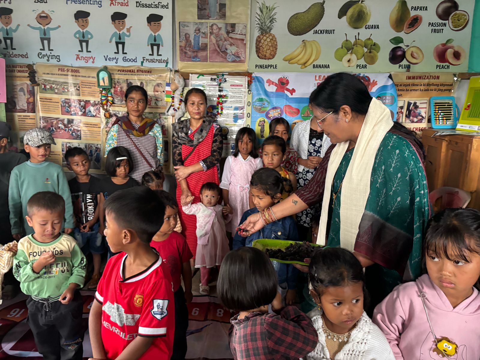 At the Anganwadi Centre in Mawsmai, the Minister reviewed services provided under the Integrated Child Development Services (ICDS) scheme, including nutrition, preschool education, and health check-ups. She praised the dedication of Anganwadi Workers and Helpers and encouraged sustained community participation in child welfare programs.