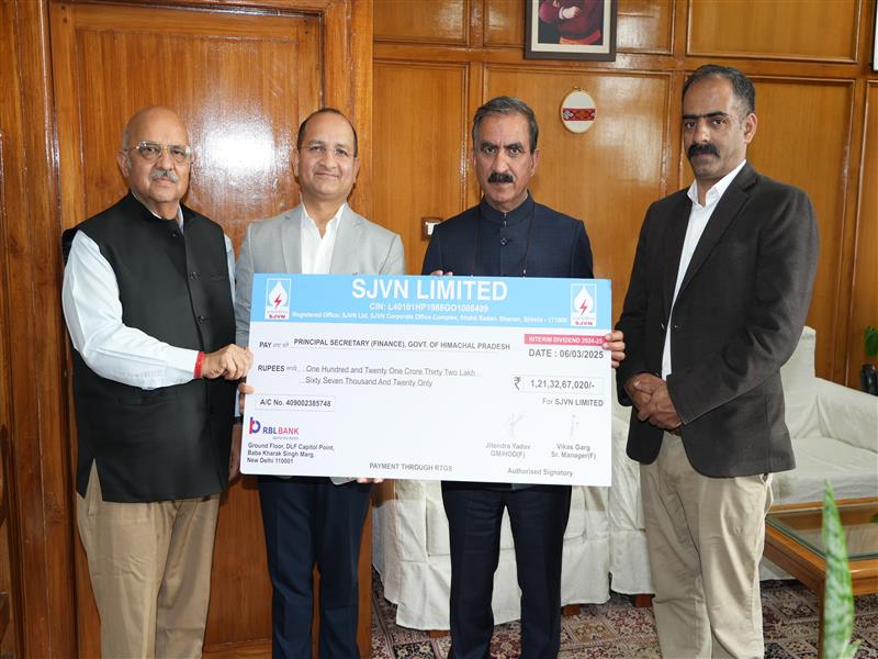 Director (Personnel), Satluj Jal Vidyut Nigam Limited Ajay Kumar Sharma along-with Consultant Dr. M.P Sood presented a cheque amounting to Rs. 1,21,32,67,020 (Rs. 121.33 crore) as part of interim dividend of the Nigam to Chief Minister Thakur Sukhvinder Singh Sukhu, here today.
