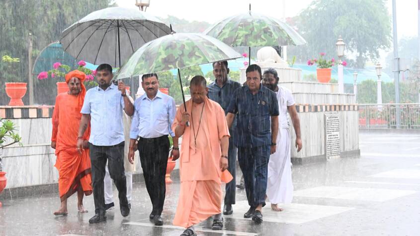 Despite heavy rain on Saturday morning, CM Yogi’s routine at Gorakhnath Temple remained unchanged. He offered prayers to Guru Gorakhnath, paid respects at the statue of his Gurudev Brahmalin Mahant Avaidyanath, and reviewed arrangements within the temple premises.