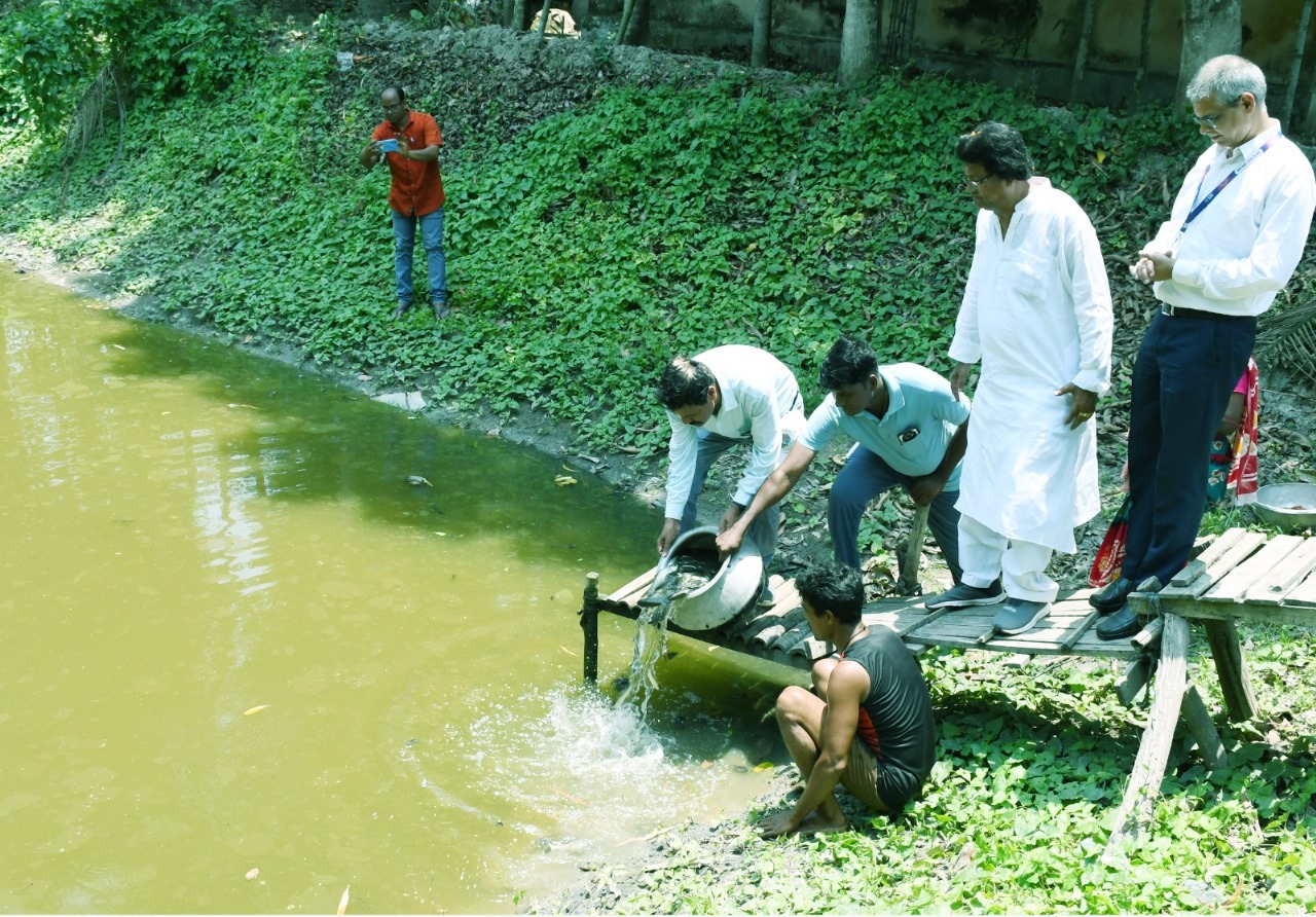 ICAR-CIFRI, a premier research institute established in 1947, has been at the forefront of inland open water fisheries development across India. With a strong focus on research, extension, and training, the institute also actively engages in livelihood enhancement programmes targeting fishers, particularly women-fishers, across the country. The programme included several key activities such as an inauguration ceremony, interaction with beneficiaries, exhibiting the project site, distribution of fish feed, and the release of fish seed into the ponds of selected beneficiaries. As part of the initial distribution, 10 kg of fish seed and 120 kg of feed were handed over to the beneficiaries.