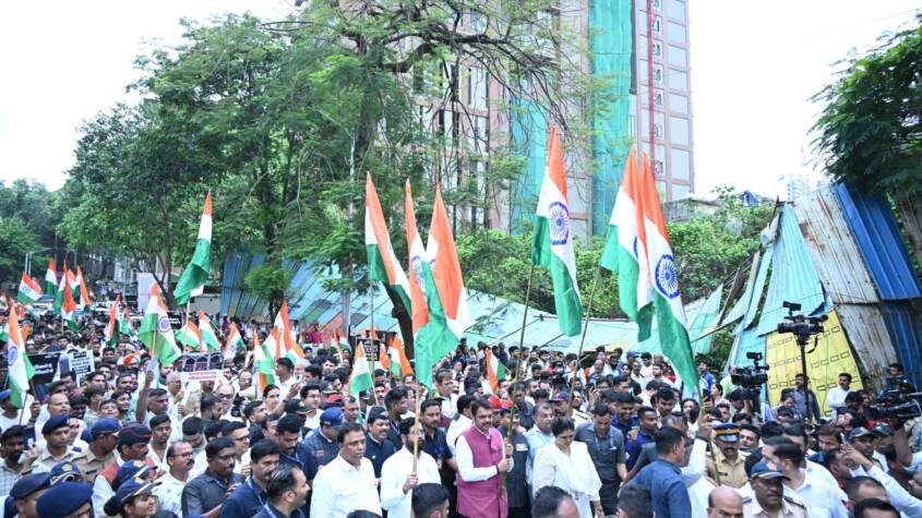 Starting from August Kranti Maidan, the rally concluded at Girgaon Chowpatty, where tributes were paid at the statue of martyr Tukaram Ombale. At the closing ceremony, CM Fadnavis and other participants laid a floral wreath at Ombale’s statue and paid respects at Tilak Memorial.