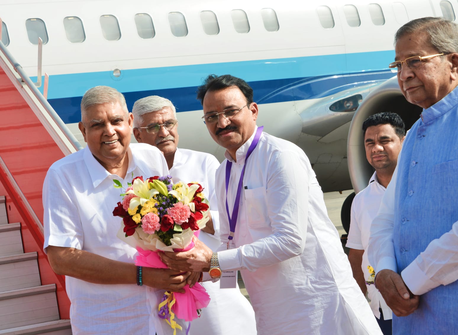 Jaipur : Deputy Chief Minister Dr. Premchand Bairwa welcomed Vice President Shri Jagdeep Dhankhar upon his arrival at the Jaipur airport on Thursday by presenting him with a bouquet. Union Minister Shri Gajendra Singh Shekhawat and MP Shri Ghanshyam Tiwari also welcomed the Vice President at the airport.