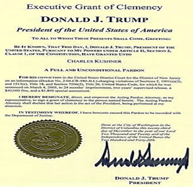 What is important is, Charles Kushner – a perpetual offender was pardoned by Trump in December 2020 after pleading guilty years earlier to tax evasions along-with illegal campaign donations. Prosecutors had alleged that he hatched a scheme for revenge and intimidation after discovering his brother-in-law was cooperating with federal authorities in an investigation, hiring a prostitute and arranging to have the encounter recorded with a hidden camera and sent to his own sister, the man’s wife.