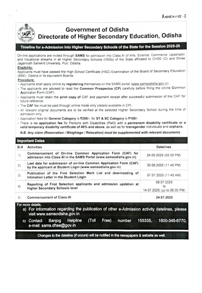 The Directorate of Higher Secondary Education, Government of Odisha, has officially announced the commencement of online admissions into Class XI for the academic session 2025–26. Applications are invited through the Student Academic Management System (SAMS) for Arts, Science, Commerce, Upashastri, and Vocational streams in Higher Secondary Schools affiliated with CHSE (O) and Shree Jagannath Sanskrit University, Puri.