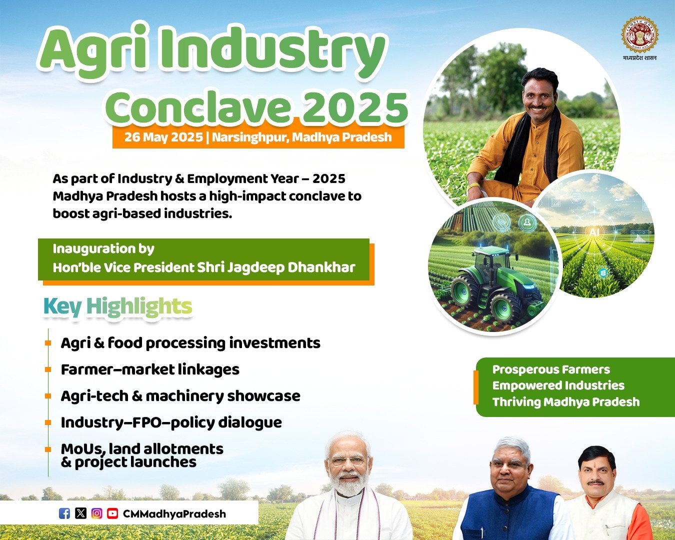 A grand three-day ‘Agri-Industry Conclave’, dedicated to innovation, technological advancement, and farmer welfare in the agriculture and horticulture sectors, will be held from May 26 to 28 near the Agricultural Produce Market in Narsinghpur.Vice President Shri Jagdeep Dhankhar will inaugurate the event.