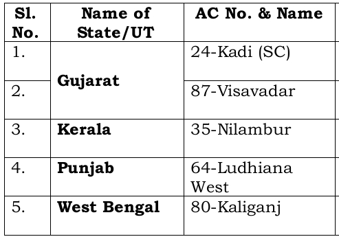 The five constituencies going to the polls include Kadi (SC) and Visavadar in Gujarat, Nilambur in Kerala, Ludhiana West in Punjab, and Kaliganj in West Bengal.