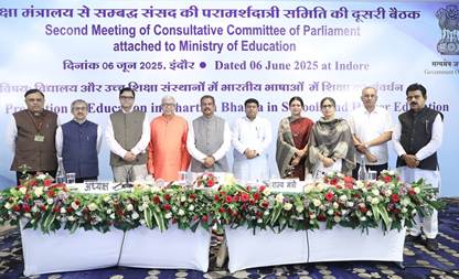 Union Minister for Education, Shri Dharmendra Pradhan, today chaired a meeting of the Consultative Committee of Parliament for the Ministry of Education on the theme of Promotion of Education in Bharatiya Bhasha in Higher Education, in Indore, Madhya Pradesh. Union Minister of State for Education and Development of the North Eastern Region, Dr. Sukanta Majumdar was also present at the meeting. Secretary, Department of School Education and Literacy, Ministry of Education, Shri Sanjay Kumar; Secretary, Department of Higher Education, Ministry of Education, Dr. Vineet Joshi; and other senior officials of the Ministry, AICTE, UGC, and Bharatiya Bhasha Samiti also attended the meeting.