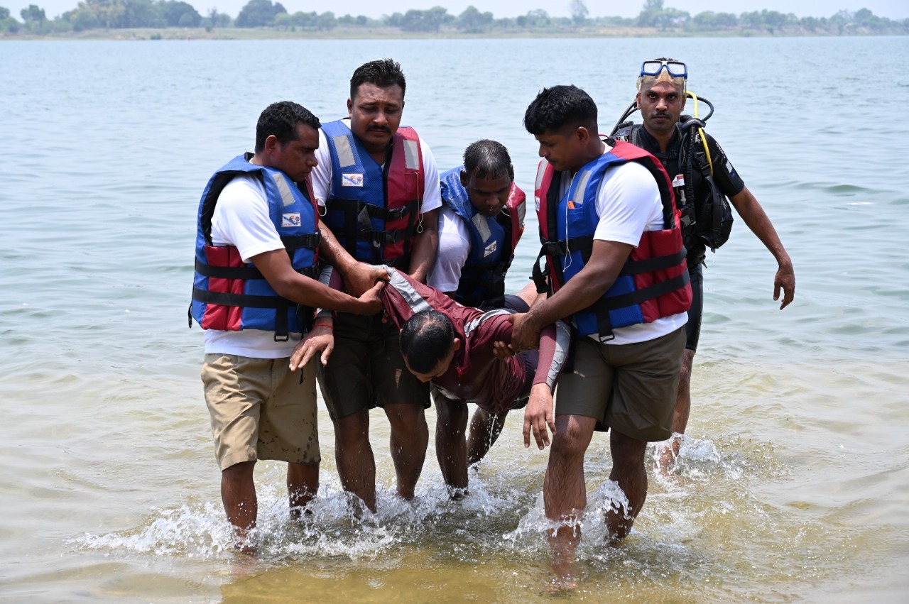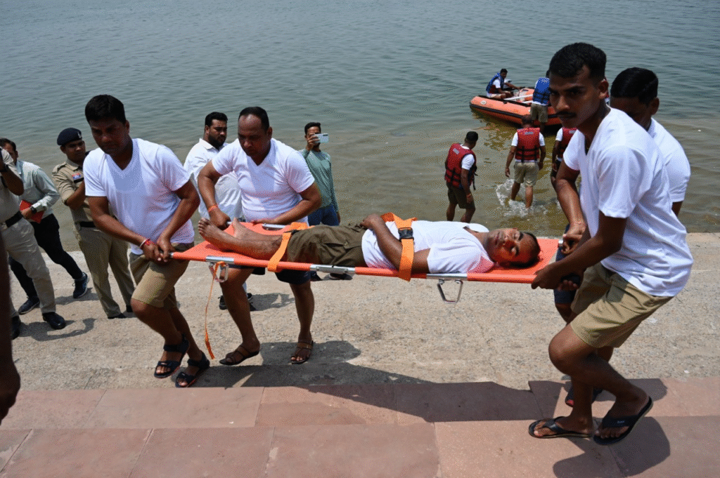 During the drill, a joint team from SDRF (State Disaster Response Force) and Nagar Sainik (Home Guard) demonstrated flood and fire disaster management using available rescue equipment. The demo included the use of motor boats, scuba diving gear, life jackets, searchlights, and other modern tools. The team also demonstrated how everyday household items like drums, earthen pots, plastic bottles, and tubes can be improvised into makeshift rafts and life jackets to save lives during emergencies.