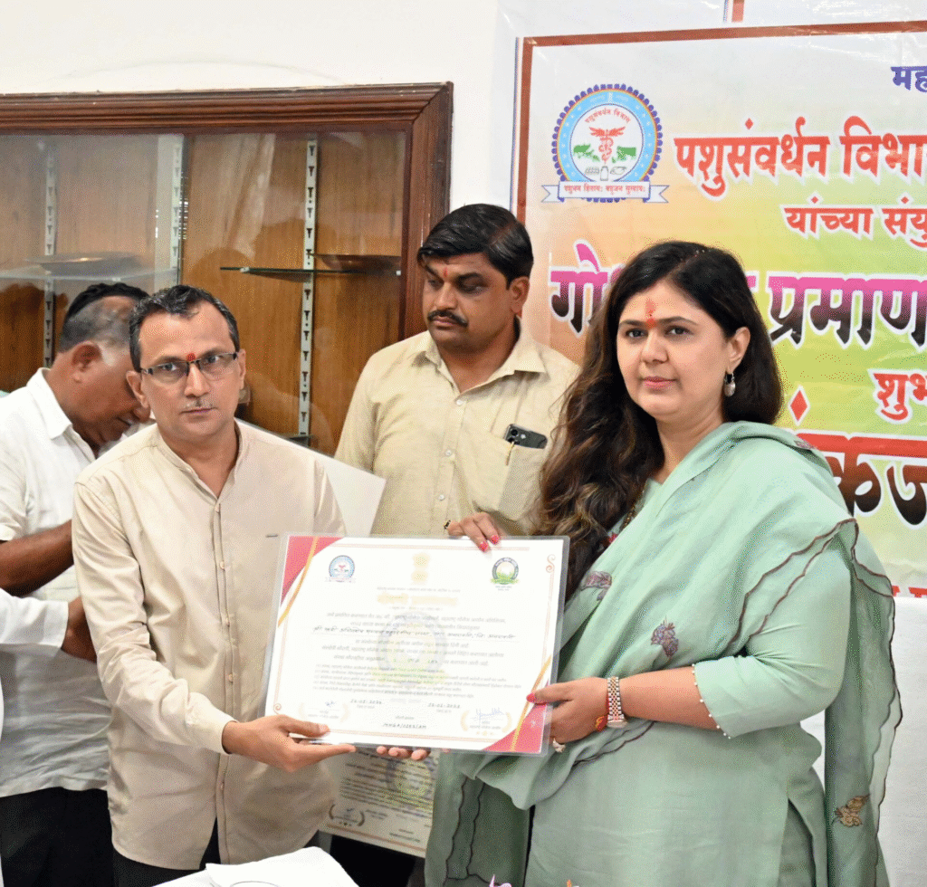 Under the Desi Cow Nourishment Scheme, over 3,000 cows have been provided subsidies. Additionally, under the Human Development Programme, dairy animals are being distributed and beneficiaries are being trained. Minister Munde instructed that records of these distributed animals be maintained and necessary support be extended. Since dairy animals require fodder, arrangements should be made through the Fodder Development Programme. Under the Mahamesh Scheme, benefits have already been provided to 217 beneficiaries, and she asked for special attention to be paid to its implementation. On the occasion, Minister Munde also distributed Gaushala Registration Certificates symbolically to representatives.