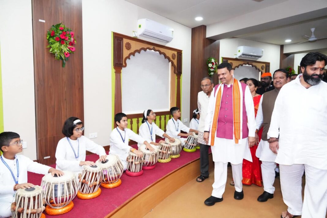 The program began with CM Fadnavis inaugurating key facilities at the Sant Tukaram Maharaj Santpeeth in Chikhli, including the Sant Malharpant Kulkarni Vocal Room, Sant Sonba Thakur Pakhawaj Room, Pandit Arvind Mulgavkar Tabla Room, and the Alijabahadur H.B.P. Mahadji Shinde Auditorium. He also launched the institution’s textbooks.