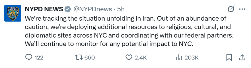 The New York Police Department (NYPD) announced increased vigilance and visible security reinforcements throughout the city. “We’re tracking the situation unfolding in Iran,” the department said in a post on X (formerly Twitter). “Out of an abundance of caution, we’re deploying additional resources to religious, cultural, and diplomatic sites across NYC and coordinating with our federal partners. We’ll continue to monitor for any potential impact to NYC.”
