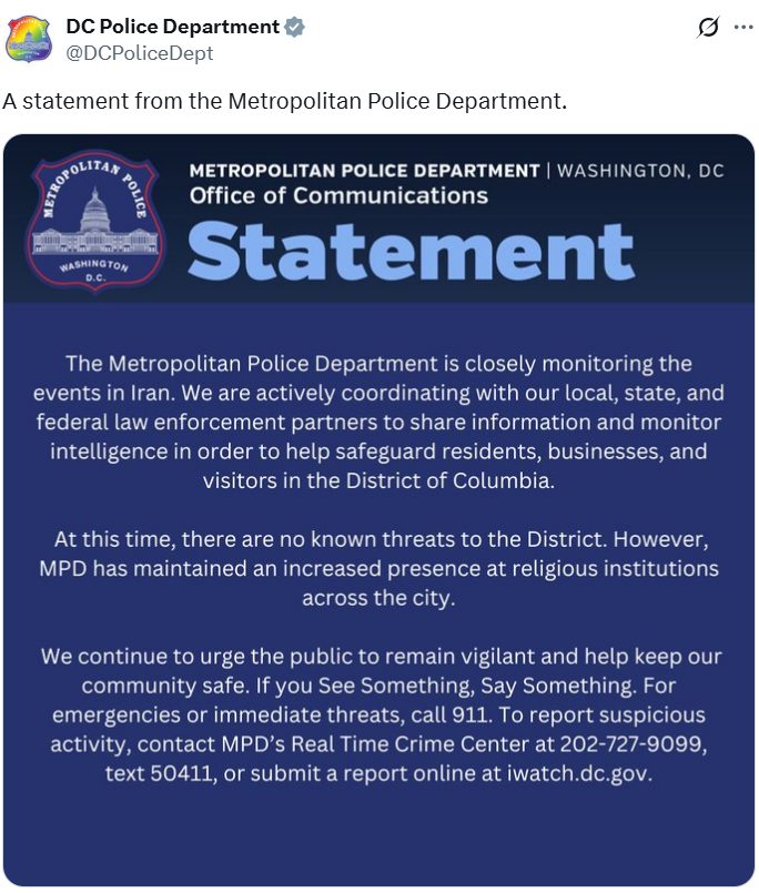 In Washington, D.C., the Metropolitan Police Department (MPD) issued a similar advisory, confirming coordination with multiple law enforcement and intelligence agencies. “The Metropolitan Police Department is closely monitoring the events in Iran. We are actively coordinating with our local, state, and federal law enforcement partners to share information and monitor intelligence in order to help safeguard residents, businesses, and visitors in the District of Columbia,” the statement said.