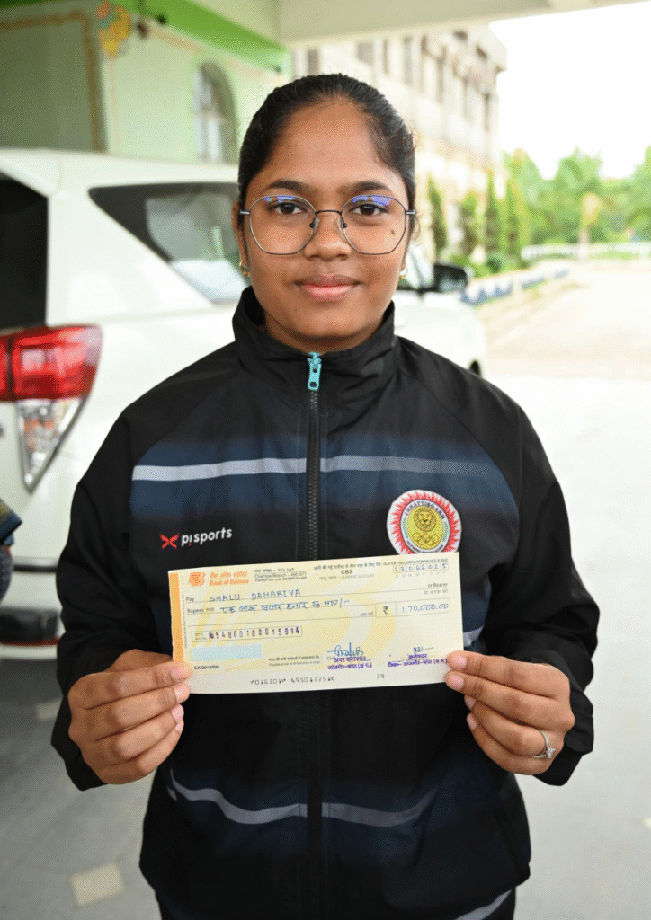 In a swift response to the Chief Minister’s directive, Janjgir-Champa Collector Mr. Janmejay Mahobe handed over a cheque of ₹1.70 lakh to Shalu as financial aid and wished her success in the competition.