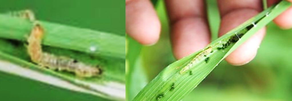 Leaf folder caterpillars primarily damage plants by feeding on the leaves, causing visible streaks or patches on the foliage. In severe infestations, the damage can lead to a scorched or whitish appearance of the entire field. Plants are particularly vulnerable to leaf folder damage during their early growth stages.