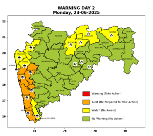 In the past 24 hours (up to the morning of June 23, 2025), Palghar district recorded the highest rainfall at 73.3 mm, followed by Sindhudurg (36.4 mm), Ratnagiri (25.8 mm), Thane (14.3 mm), and Kolhapur (13.9 mm).