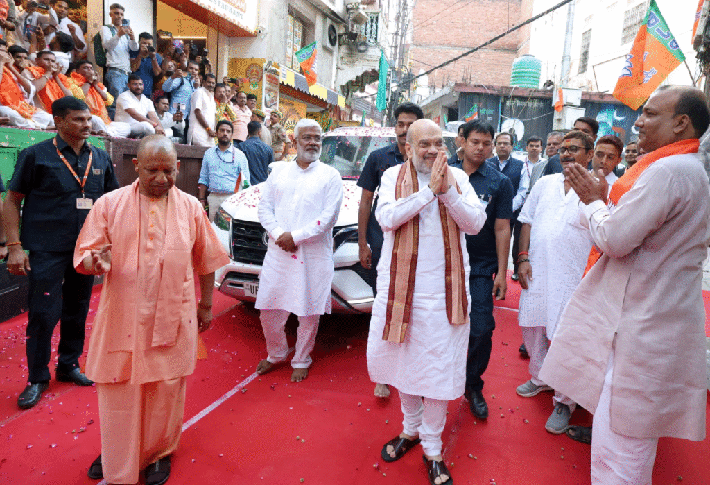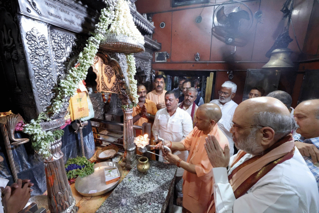 After leaving the airport, Union Home Minister Amit Shah and CM Yogi Adityanath headed straight to the Kal Bhairav temple. Residents of Kashi welcomed them with conch blowing and chants of “Har Har Mahadev”. Both leaders greeted the people with folded hands before proceeding to Hotel Taj in Nadesar.