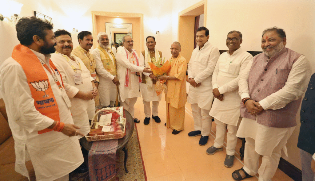 CM Yogi Adityanath was also welcomed by Labour & Employment Minister Anil Rajbhar, Urban Development & Energy Minister A.K. Sharma, Jal Shakti Minister Swatantra Dev Singh, Industrial Development Minister Nand Gopal Gupta ‘Nandi’, District Panchayat President Poonam Maurya, MLAs Dr. Awadhesh Singh and Saurabh Srivastava, MLCs Hansraj Vishwakarma and Dharmendra Rai, Divisional Commissioner S. Rajalingam and others. CM Yogi also held courtesy meetings with Uttarakhand CM Pushkar Singh Dhami and Chhattisgarh CM Vishnu Deo Sai.