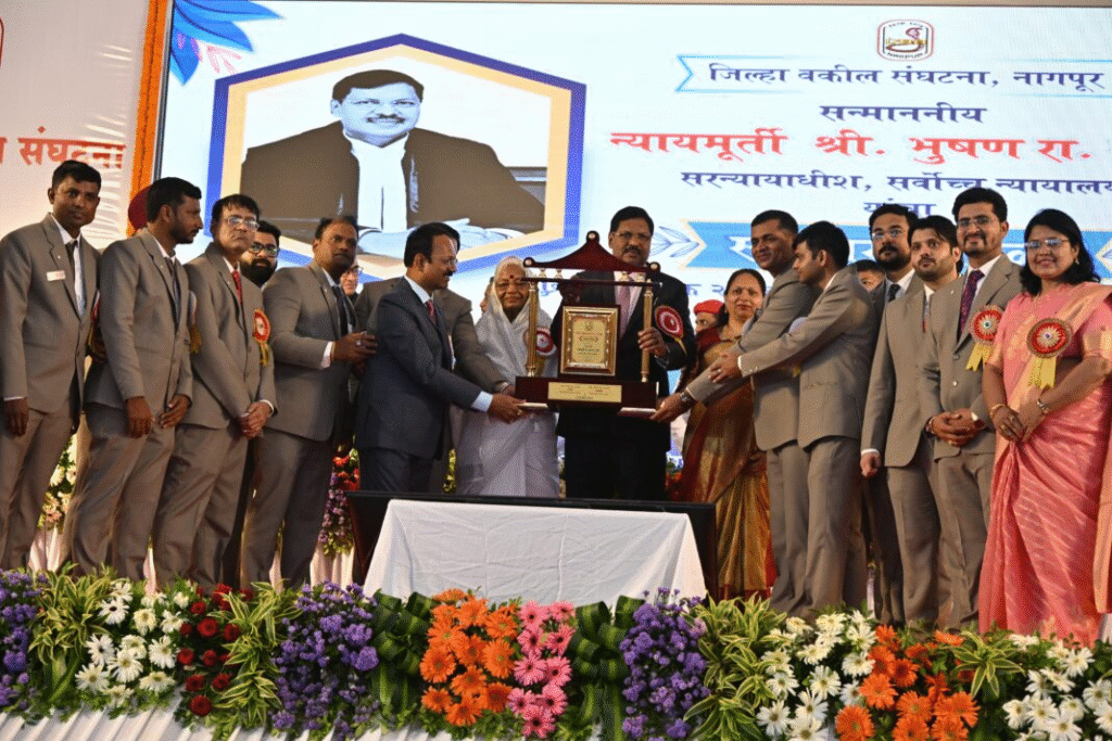 On behalf of the Nagpur District Bar Association and other legal associations from Vidarbha, Justice Gavai was formally felicitated. Association President Adv. Roshan Bagde delivered the welcome address, and Secretary Manish Randive proposed the vote of thanks.