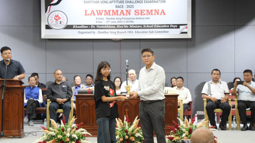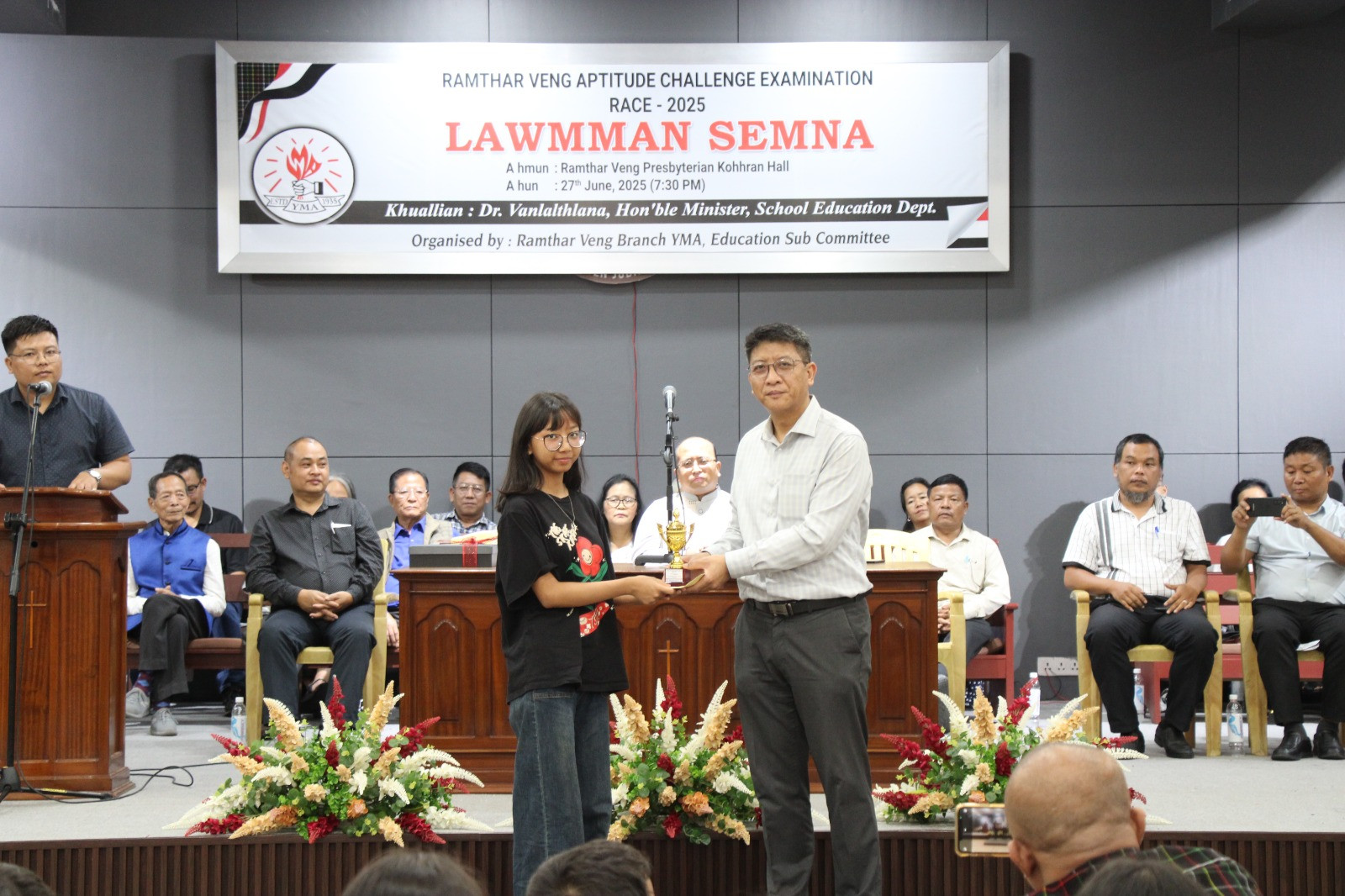 Aizawl : The prize distribution ceremony for the Ramthar Veng Aptitude Challenge Examination (RACE) 2025, organised by the Ramthar Veng Branch YMA Education Sub-Committee, was held at the Ramthar Veng Presbyterian Church Hall. The event was graced and officially inaugurated by School Education Minister Dr. Vanlalthlana, who is also the local MLA.