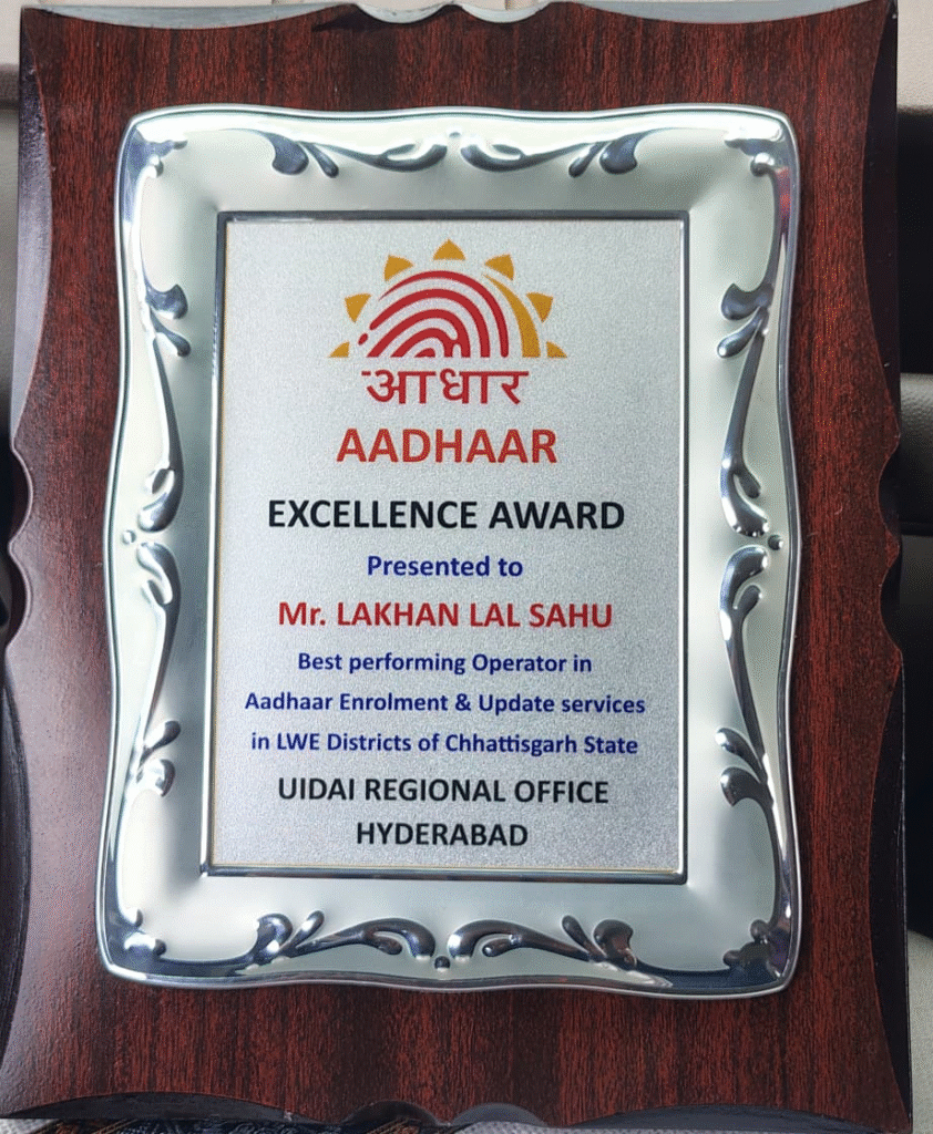 Recognising his outstanding contribution, Aadhaar service operator Mr. Lakhan Lal Sahu was awarded the “Best Performing Operator in Aadhaar Enrolment & Update Services in LWE Districts of Chhattisgarh” by the UIDAI Regional Office, Hyderabad. He received the honour at a felicitation ceremony held in Raipur on June 20, 2025.