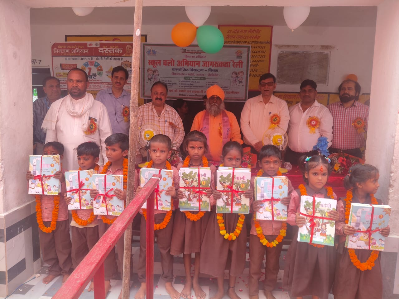 At the Adarsh Samvilian Vidyalaya in Nagar area of Prayagraj, children were given books and stationery by the Chief Development Officer. A student rally was flagged off, and under the ‘Ek Ped Maa Ke Naam’ campaign, saplings of Rudraksh, Parijat, and Mahogany were planted.