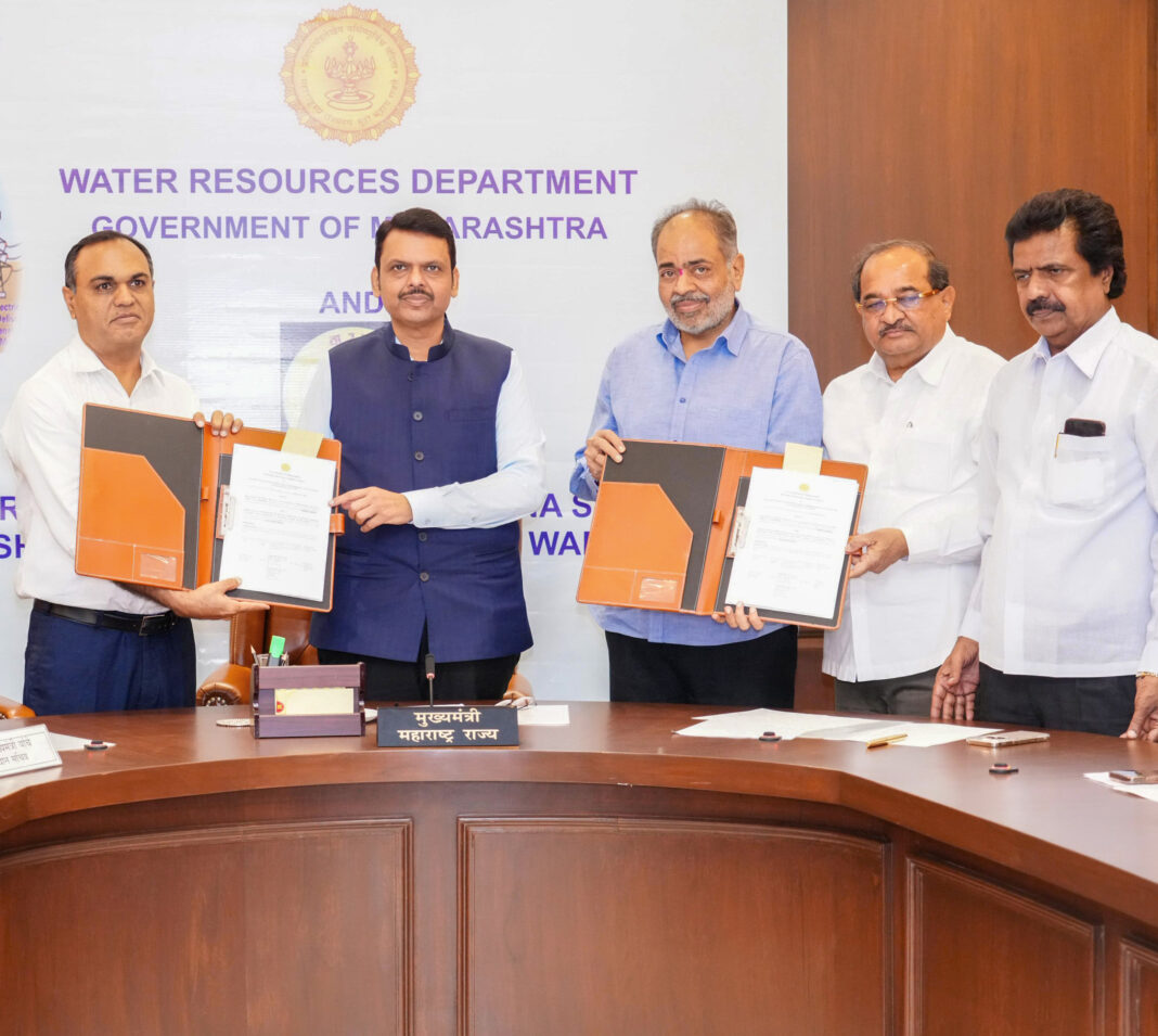 A Memorandum of Understanding (MoU) was signed between the Water Resources Department and the Tatyasaheb Kore Warana Cooperative Navshakti Nirman Sanstha Ltd. for a pumped-storage hydro project at the Vidhan Bhavan in Mumbai. Present at the occasion were Water Resources Minister Radhakrishna Vikhe Patil, MLA Vinay Kore, Principal Secretary to the CM Ashwini Bhide, Additional Chief Secretary of the Water Resources Department Deepak Kapoor, CM’s Principal Secretary Dr. Shrikar Pardeshi, and Warana representative N.H. Patil, among others.