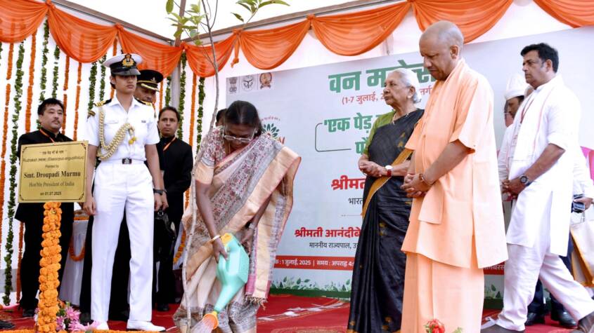 The tree plantation took place before the stage proceedings began, becoming a memorable moment etched into the heart of the campus. During the formal ceremony, Chief Minister Yogi Adityanath honored the President with a memento as a token of respect. Governor Anandiben Patel also presented her with the first copy of the university’s formulary and the first edition of the ‘Sankalp Se Siddhi’ policy document.