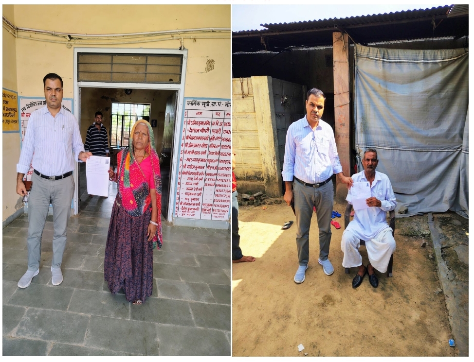As part of the same campaign, a block-level follow-up camp was held on Tuesday in Sambhar Lake Panchayat Samiti. Based on received requests, the Social Security Officer visited Naurangpura Gram Panchayat and verified the eligibility of Geeta Devi Balai and Amar Chand Raigar under the Specially Abled and Senior Citizen Respect Pension Schemes.