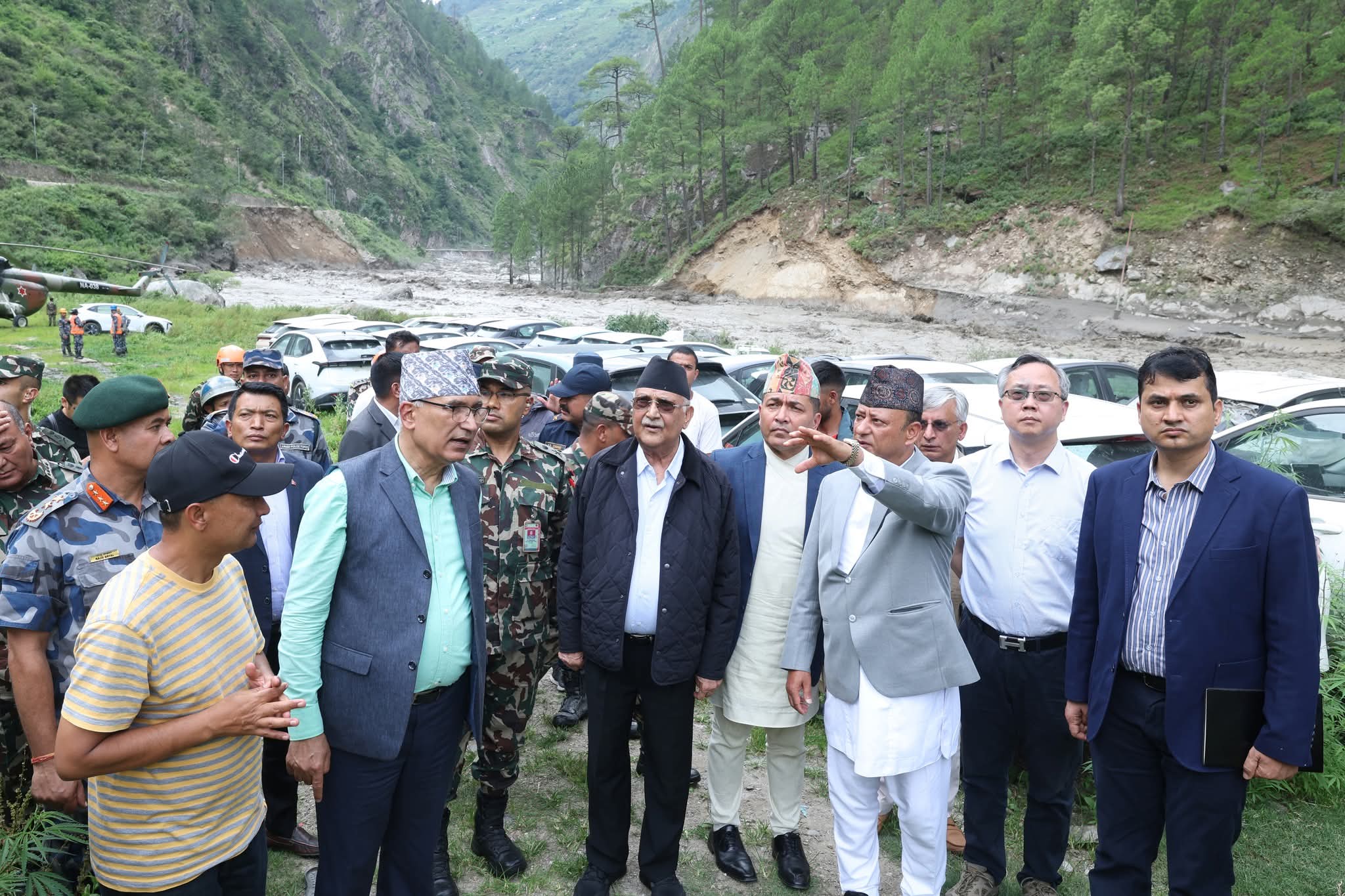 Accompanied by Deputy Prime Minister and Finance Minister Bishnu Prasad Paudel, Home Minister Ramesh Akhtar, Energy Minister Deepak Khadka, and senior security officials, PM Oli reviewed the situation on the ground and interacted with personnel leading rescue operations. Several sections of the Lhamu highway remain impassable due to the damage.