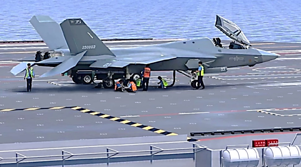 Unlike the PLAN’s (Chinese Navy) current J-15 fighters operating from the Liaoning and Shandong carriers using ski-jump (STOBAR) configurations, the J-35 is designed for CATOBAR (Catapult-Assisted Take-Off But Arrested Recovery) operations. The new fighter incorporates multiple key design features for carrier use, including reinforced landing gear, folding wingtips for tighter carrier storage, and a tailhook system for arrested landings. Its low-observable airframe, optimized engine inlets, and embedded sensors make it a true fifth-generation platform, bridging the technology gap with the US Navy’s F-35C.