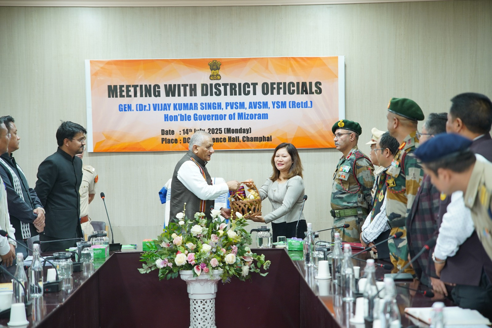 Upon his arrival at Champhai Helipad, the Governor was received by Champhai DC Pu Mohammad Aaquib and Addl. SP Victor Zothansanga and was accorded a ceremonial guard of honour. Subsequently, a formal meeting with senior officials of various government departments was held at the Deputy Commissioner’s Conference Hall in Keifangtlang.