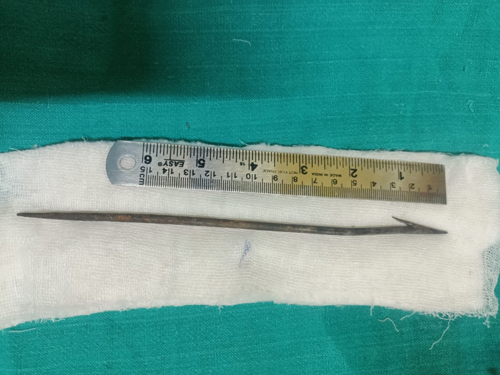“The rod was embedded deep between major facial structures. We had to carefully separate the parotid tissue and navigate around the facial nerve, which passes through the gland, to remove the foreign object without causing nerve damage. The rod’s tip was dangerously close to the main blood vessels and spinal nerves, making it a highly sensitive and critical procedure.”