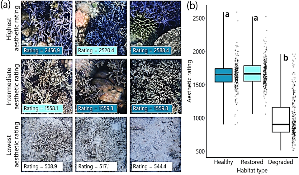 These ratings were implemented in the training of a machine-learning algorithm based on AI to reliably predict people’s visual preferences for photographs of different coral habitats. The results of people’s survey responses and the machine learning algorithm were the same. Images of restored reefs were consistently rated just as beautiful as those of healthy reefs, and far more aesthetically pleasing than degraded reefs. This is encouraging, and important. It shows that efforts to rebuild these charismatic ecosystems can recreate the beauty that makes them so highly valued.