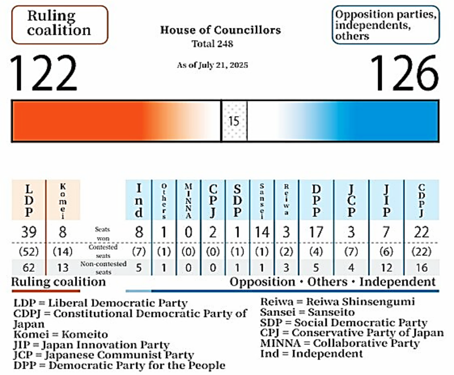 The latest election setback will raise the prospects of political deadlock without opposition support, as the upper house, although less powerful than the House of Representatives, is still important to smoothly enact laws and advance policies. The LDP and Komeito failed to clear the majority threshold in the 248-member upper house, a hurdle seen as relatively low. After Sunday’s election, the total number of seats the ruling camp holds fell to 122 from 141.