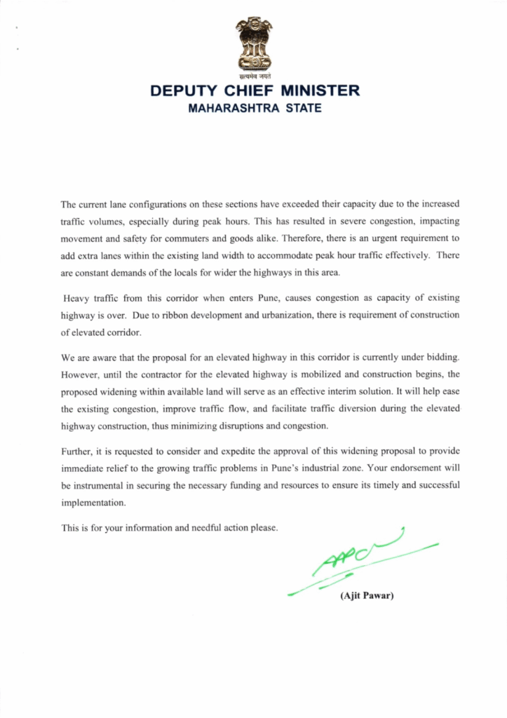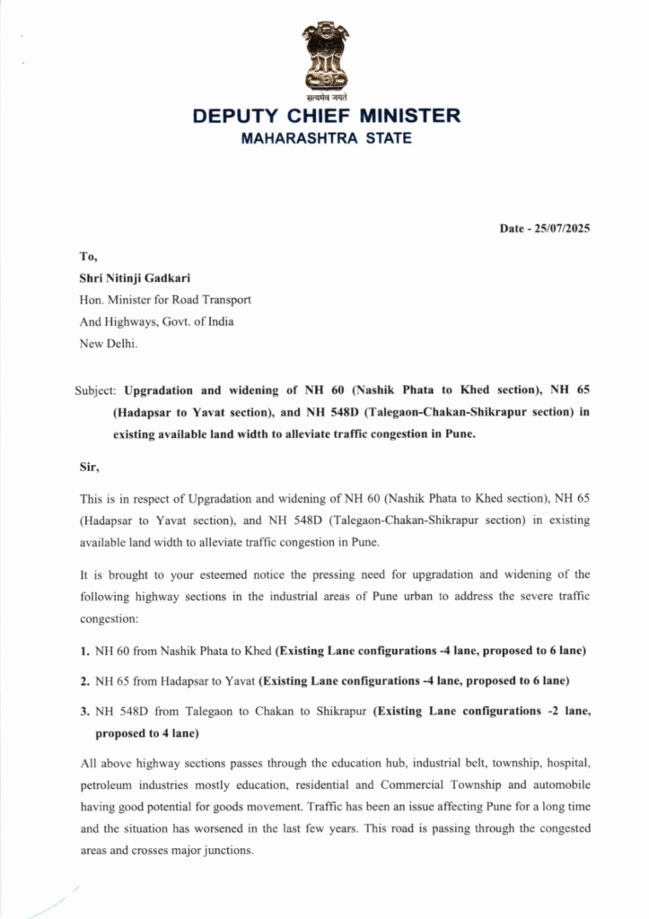 The Deputy Chief Minister concluded by requesting Minister Gadkari to approve the proposal and ensure prompt release of funding and administrative clearance. This, he said, would go a long way in addressing the growing transportation challenges in Pune’s industrial belt.