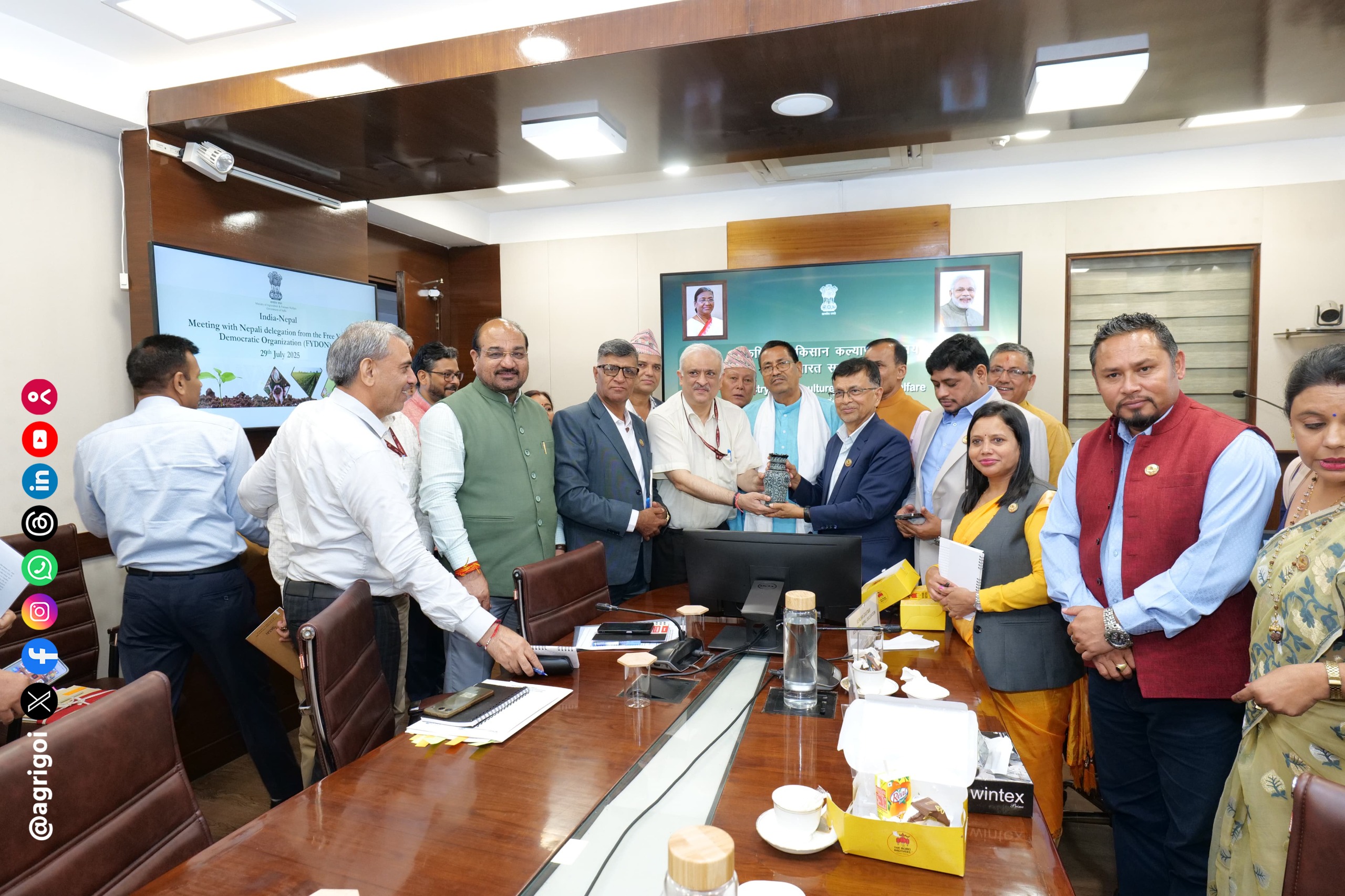 A 16-member delegation comprising Members of Parliament from Nepal, led by Shri Sanjay Kumar Gautam, Former Minister and Member of Parliament (Nepali Congress), visited Krishi Bhawan, New Delhi, today. The delegation, representing the Free Youth Democratic Organization (FYDON), Nepal, held detailed discussions with Shri Devesh Chaturvedi, Secretary, Department of Agriculture & Farmers Welfare (DA&FW), and Dr. Mangi Lal Jat, Secretary, Department of Agricultural Research & Education (DARE).