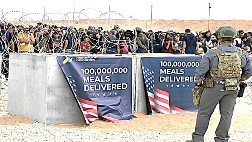 “GHF delivers more than one million meals a day, an incredible feat!” wrote Huckabee on social media, along with photos of himself and Witkoff engaged in discussions with GHF staff. He has also posted images of GHF banners proclaiming “100 million meals delivered” alongside an American flag. A queue of waiting civilians could be seen behind the banners and a razor wire barrier.