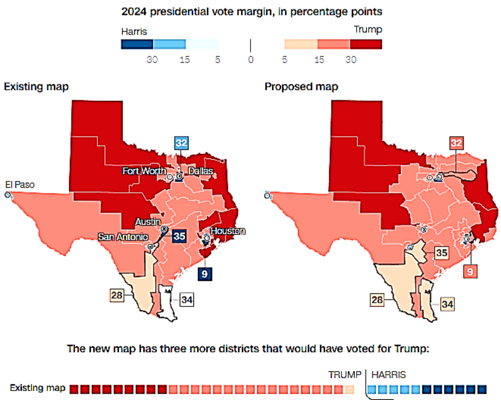 The latest escalation in Texas could preview more bitter fights ahead as GOP states face intensifying pressure from Trump to redraw more maps to their advantage where possible. Democrats have vowed retribution in states where they control district boundaries. The Republicans of Texas has targeted Democratic seats with proposed congressional map. The map aims to flip five US House seats in the 2026 midterms in a rare mid-decade redistricting.