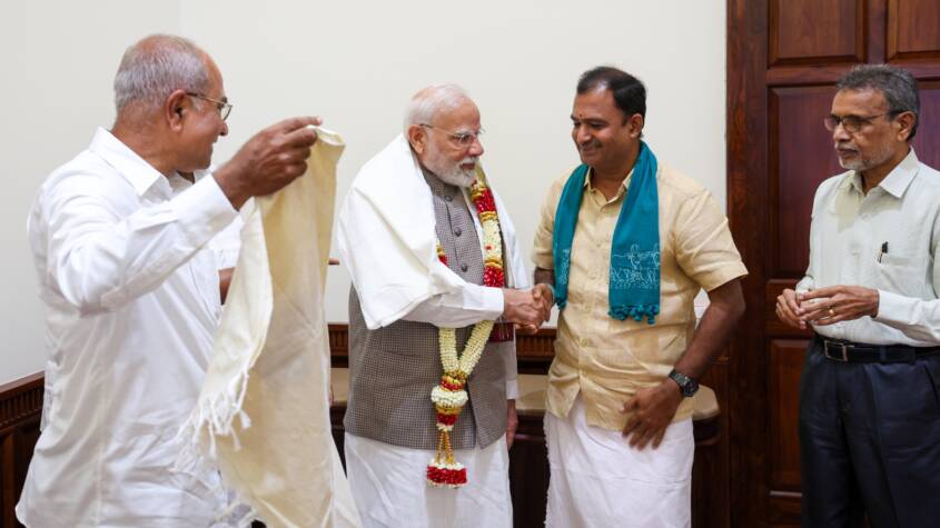 “Earlier today in Parliament, met a group of farmers from Tamil Nadu. Was amazed to hear about their experiences and their focus on innovation and embracing new farming techniques to boost productivity as well as increase sustainability.”
