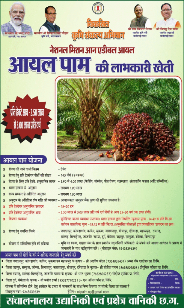 Under the leadership of Chief Minister Vishnudev Sai and the guidance of Agriculture Minister Ramvichar Netam, the state is encouraging farmers to grow horticultural crops. Efforts have been made to promote oil palm cultivation in 17 districts, including Bastar (Jagdalpur), Kondagaon, Kanker, Sukma, Narayanpur, Bijapur, Dantewada, Mahasamund, Raigarh, Sarangarh-Bilaigarh, Janjgir-Champa, Durg, Bemetara, Jashpur, Surguja, Korba, and Bilaspur.