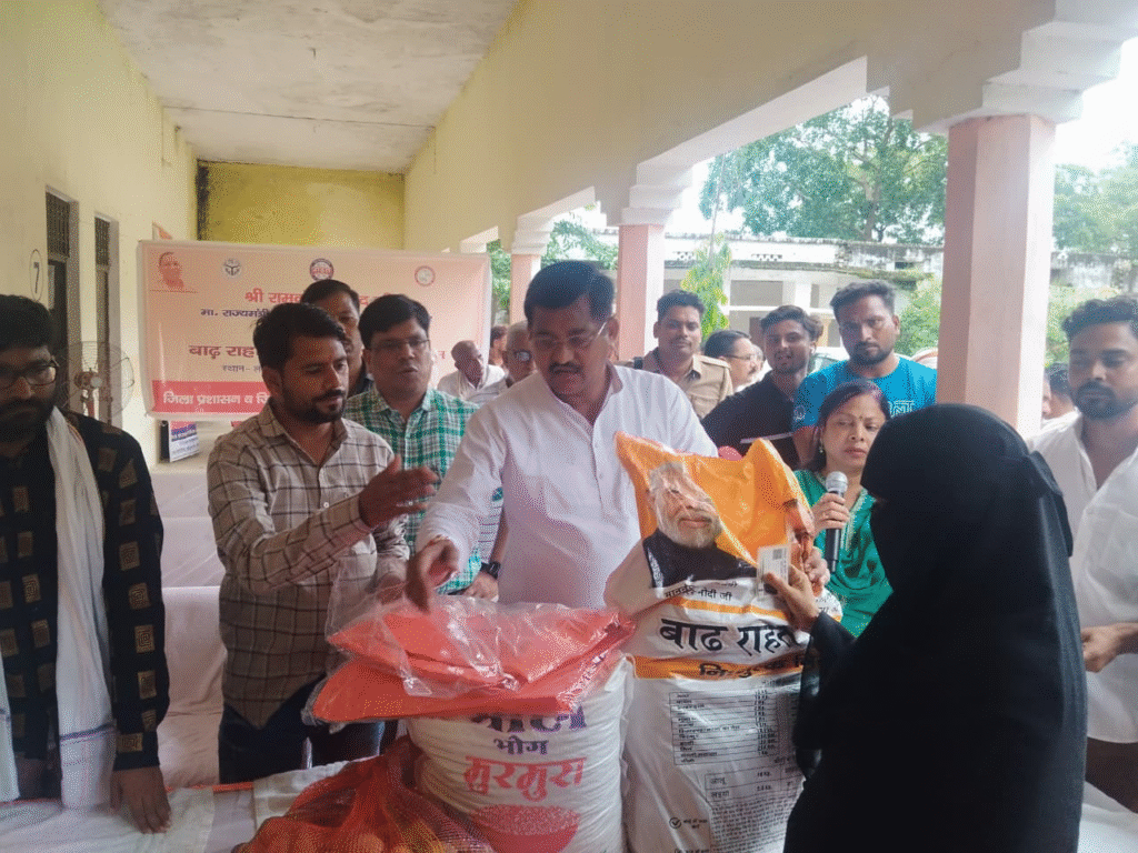 In Ballia, Transport Minister Dayashankar Singh distributed ration kits at the Town Hall premises, affirming the government’s commitment to ensuring that no affected person is left without relief. He emphasized that, under the leadership of CM Yogi Adityanath, the state government is closely monitoring the situation and providing timely aid to every needy person. He also thanked the district administration for its cooperation in managing the flood crisis.