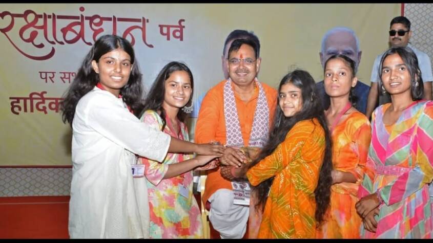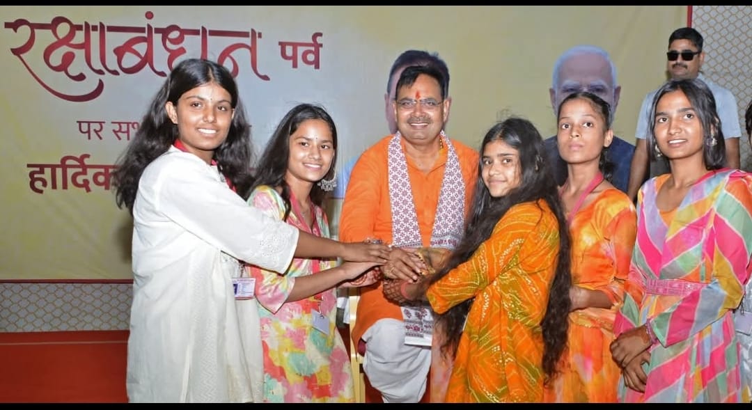 At the Raksha Samman ceremony held at the Chief Minister’s residence, 231 students and 8 teachers from PM Shri Government Adarsh Girls’ Higher Secondary School (Gangauri Bazaar), Mahatma Gandhi Government School (Jadia Colony, Raj Bhavan), Shaheed Lieutenant Abhay Parik Government Girls’ Higher Secondary School (Gandhinagar), and Maharaja Government Girls’ Higher Secondary School (Chhoti Chaupar) tied rakhis to Chief Minister Shri Bhajanlal Sharma.