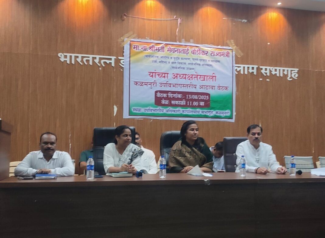 Hingoli, Aug 2025 : The government is implementing numerous schemes for the welfare of the general public. These schemes must be effectively implemented so that their benefits reach every citizen, directed Minister of State for Public Health and Family Welfare, Water Supply and Sanitation, Energy, Women and Child Development, and Public Works (Public Enterprises) Meghna Sakore-Bordikar during a review meeting of the Kalamnuri and Vasmat sub-divisions.