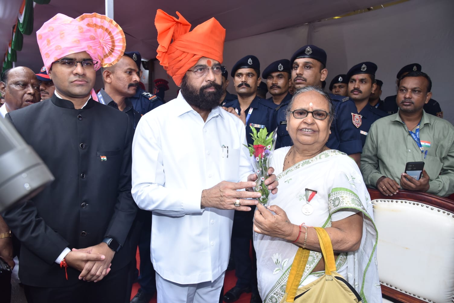 On this occasion, MP Naresh Mhaske, MLA Sanjay Kelkar, former MLA Ravindra Phatak, District Collector Dr. Shrikrishna Panchal, Thane Municipal Commissioner Saurabh Rao, Thane Police Commissioner Ashutosh Dumbre, Zilla Parishad CEO Rohan Ghughe, Director of Directorate of Vocational Education and Training Madhavi Sardesmukh, District Superintendent of Police Dr. D. Swami, Additional Commissioner of Police Dr. Dnyaneshwar Chavan, Additional Commissioner of Police (Administration) Shrikant Pathak, Vinayak Deshmukh, DCP Dr. Pavan Bansod, Pankaj Shirsat, Subhash Burse, Additional Superintendent of Police Anmol Mittal, Additional District Collector Harishchandra Patil, Resident Deputy Collector Dr. Sandip Mane, Deputy Collector (General Administration) Rupali Bhalke, Deputy Collector Sarjerao Maske-Patil, Deputy District Election Officer Vaishali Mane, Prant Officer Urmila Patil, District Planning Officer Vaibhav Kulkarni, District Superintendent Land Records Nitin Patil, Regional Transport Officer Hemangini Patil, Thane Municipal Deputy Commissioner Madhukar Bodke, District Mining Officer Vivek Ghule, Deputy Director of Health Dr. Ashok Nandapurkar, Joint Director of Industries Viju Shirsath, Deputy Director Seema Pawar, District Civil Surgeon Dr. Kailas Pawar, Dr. Archana Pawar, District Malaria Officer Dr. Santoshi Shinde, Deputy CEO of Zilla Parishad Pramod Kale, District Health Officer Dr. Gangadhar Parge, Deputy Superintendent Land Records Sachin Wagh, Assistant Commissioner of Police Priya Dhakane, District Sports Officer Suvarna Bartakke, General Manager of District Industries Centre Sonali Devre, Tehsildar Sandip Thorat, Umesh Patil, Sachin Choudhar, Revan Lembhe, Pradeep Kudal, Ujjwala Bhagat, Smita Mohite, Amol Kadam, Naib Tehsildar Rahul Suryawanshi, Gorakh Phadtare, Girish Kale, Umesh Mahala, Dattatraya Berde, Assistant Director (Town Planning) Disha Sawant, Manager Ashwini Kokate, other officers-employees from the district administration, officers of the police department, freedom fighters, ex-servicemen, senior citizens, students, media representatives were present.