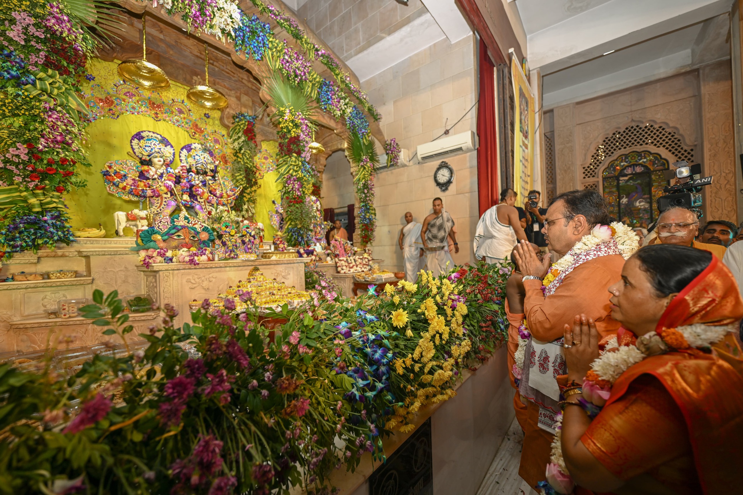 Jaipur, Aug 2025 : On the occasion of Shri Krishna Janmashtami, Chief Minister Bhajanlal Sharma, along with his wife, visited the ISKCON temple at Mansarovar on Saturday night and participated in the Janmotsav celebrations. He offered prayers to Shri Shri Giridhari Dauji, Shri Shri Radha Madan Mohan, and Shri Shri Gaur Nitai, seeking peace, prosperity, and well-being for the state.