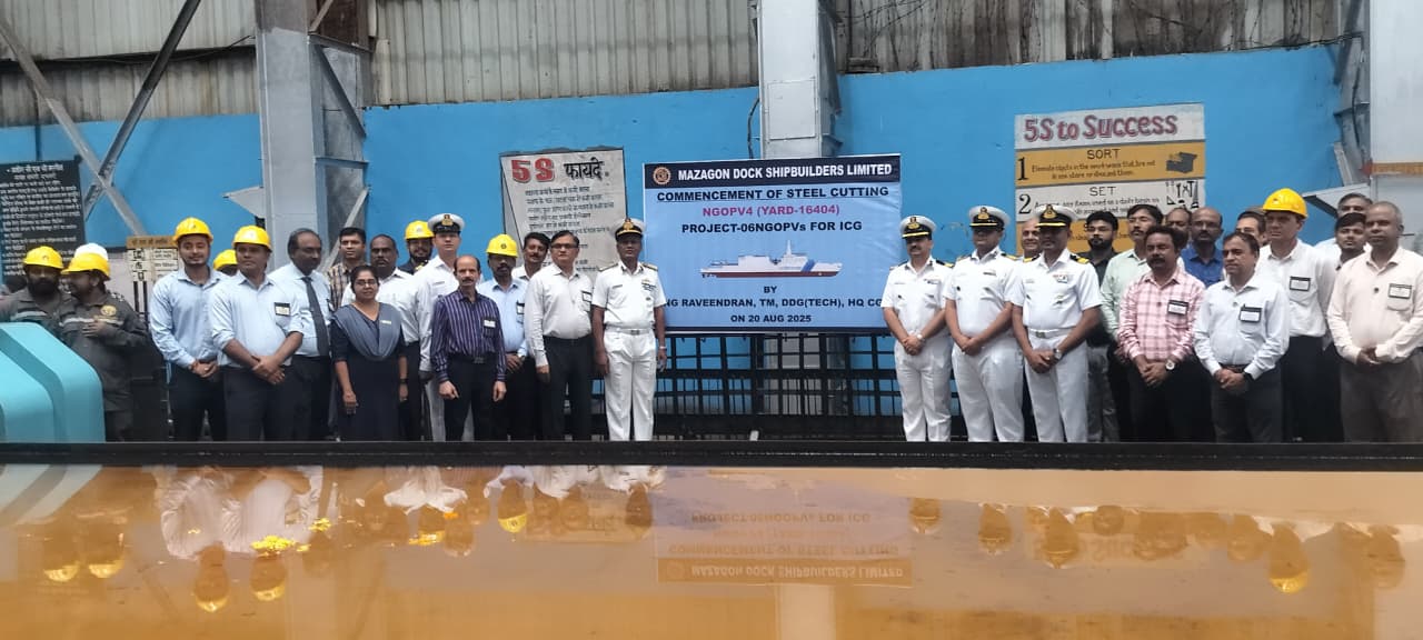 Mumbai, Aug 2025 : The Plate Cutting Ceremony of Yard 16404, the fourth in a series of six Next Generation Offshore Patrol Vessels (NGOPVs) being constructed at Mazagon Dock Shipbuilders Ltd (MDL) for Indian Coast Guard (ICG), took place in Mumbai on August 20, 2025. Designed, developed, and built indigenously, these 117-meter-long vessels are capable of speeds up to 23 knots, with an operational range of 5,000 nautical miles.