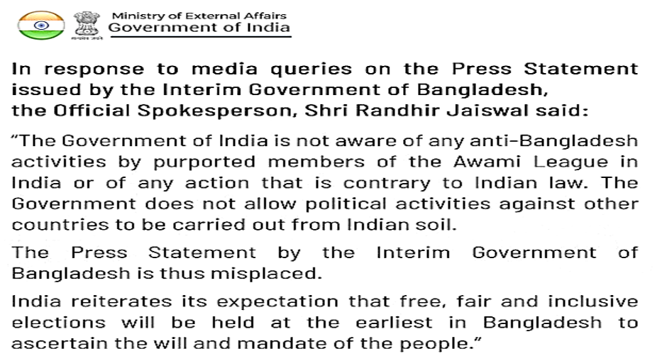 “The Press Statement by the Interim Government of Bangladesh is thus misplaced“, the MEA said. Commenting on the Dhaka’s press statement, MEA official Spokesperson Randhir Jaiswal said that, “The Government of India is not aware of any anti-Bangladesh activities by purported members of the Awami League in India or of any action that is contrary to Indian law“.