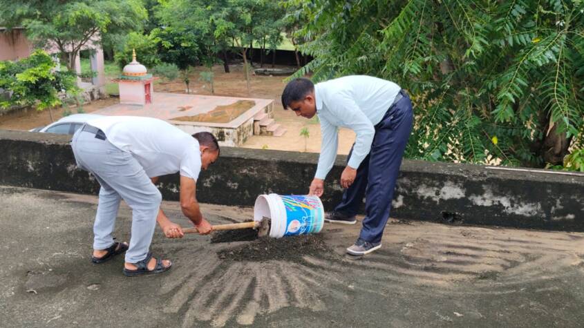 On Monday, officials inspected the condition of government buildings, school buildings, and anganwadi centers in the district. They took steps to drain water from building premises, removed water from roof tops, and filled soil in areas where soil erosion had occurred.