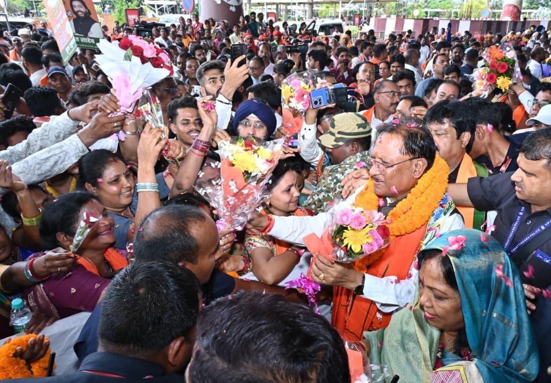 Raipur, Aug 2025 : After completing his eight-day foreign tour of Japan and South Korea, Chief Minister Shri Vishnu Deo Sai returned to Raipur today. On his arrival, he received a grand welcome at the airport. The entire airport premises reverberated with traditional Karma and Panthi dances for nearly an hour, creating a festive atmosphere. The large crowd gathered reflected both the popularity of the Chief Minister and the success of his international visit. From floral bouquets to garlands, people greeted him warmly, while a shower of flower petals accompanied his passage from the exit gate to the media gallery — a distance of about 100 meters that took nearly 15 minutes due to the overwhelming reception.
